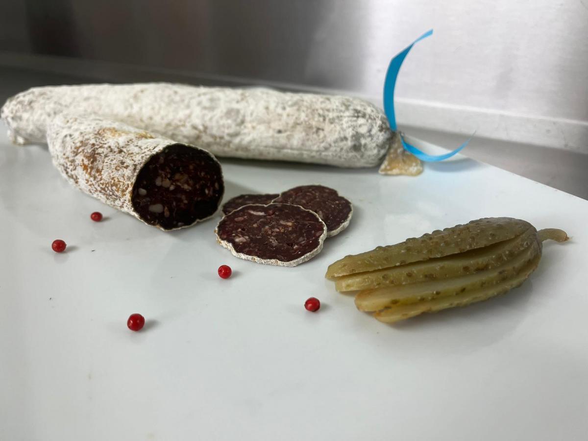 Ingrédients : viande de porc issue de la ferme, sel marin, sucre, 5 baies, 4 épices, piment